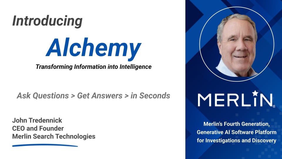 Merlin Alchemy–formerly DiscoveryPartner–represents a paradigm shift in how professional teams interact with large document sets. Our next-generation, GenAIÂ cloud platform transforms traditional discovery workflow into an intelligent, interactive process that delivers insights in minutes rather than days.
