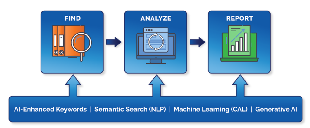 Our powerful AI foundation combines enhanced keyword search, semantic understanding, continuous learning, and GenAI analysis to handle the complex task of finding and connecting relevant information–letting you focus on strategy and client counsel.