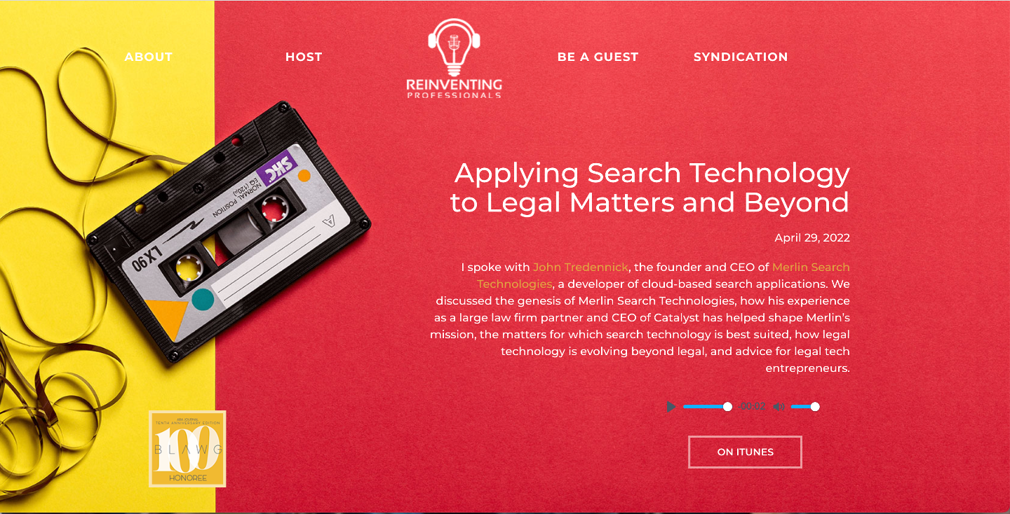 Ari Kaplan, one of the leading legal podcasters and thought leaders interviewed Merlin Search Technologies CEO John Tredennick for his award-winning podcast called Reinventing Professionals. The long-runningĀ podcast is designed to offer ideas, guidance, and perspectives on how to effectively navigate a perpetually shifting professional landscape, with a unique focus on the legal industry and the technology that is driving its evolution.