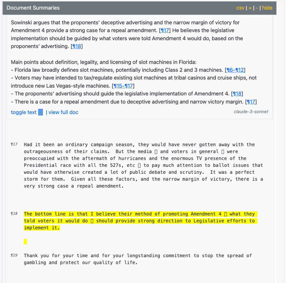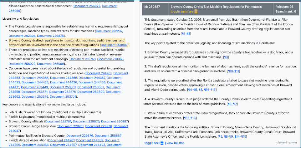 We now include paragraph references within the summary. These references tie to the actual text of the underlying document, allowing a reader to quickly match the summary statement to the relevant text in the document section.