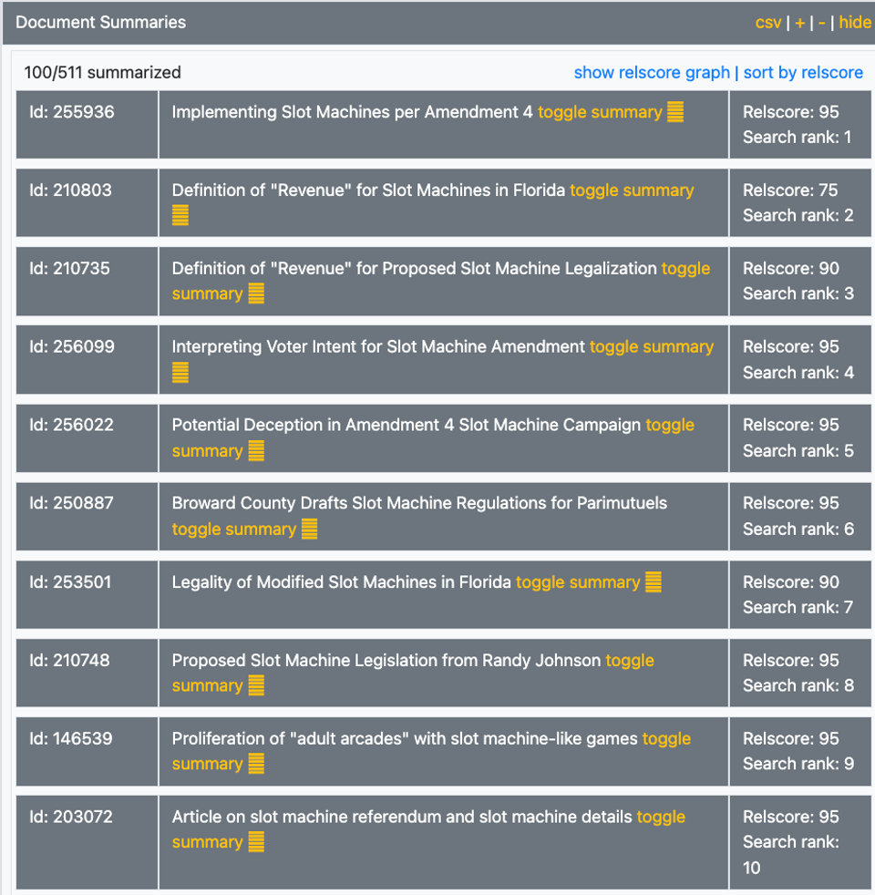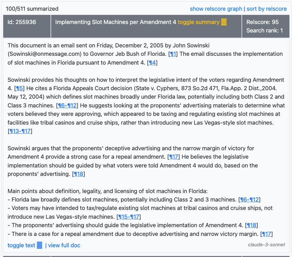 The second was syntactical, using AI to analyze for keyword similarity. We combined the rankings and promoted the top 100 documents for analysis, summarization and ranking. Let me note that all of this was done automatically in a few seconds by the system after I entered the prompt.
