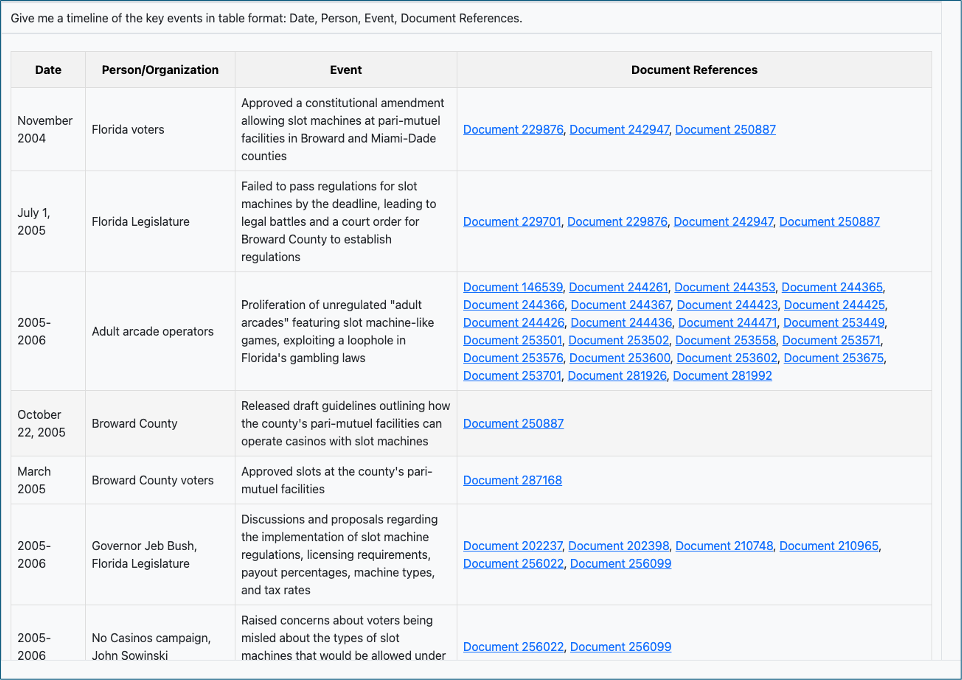 While a good associate could do this work, they might take a bit longer than the 41 seconds it took Claude Opus to read the 100 summaries and provide this timeline.