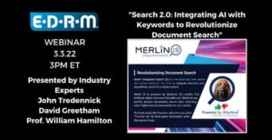 EDRM Webinar: Search 2.0: Integrating AI with Keywords to Revolutionize Document Search–March 3rd at 3 ET. Join us on March 3rd at 3 pm ET for a one-hour introduction to Search 2.0: Integrating AI with Keywords to Revolutionize Document Search. Merlin CEO John Tredennick will lead a panel on the move from keywords to algorithmic
