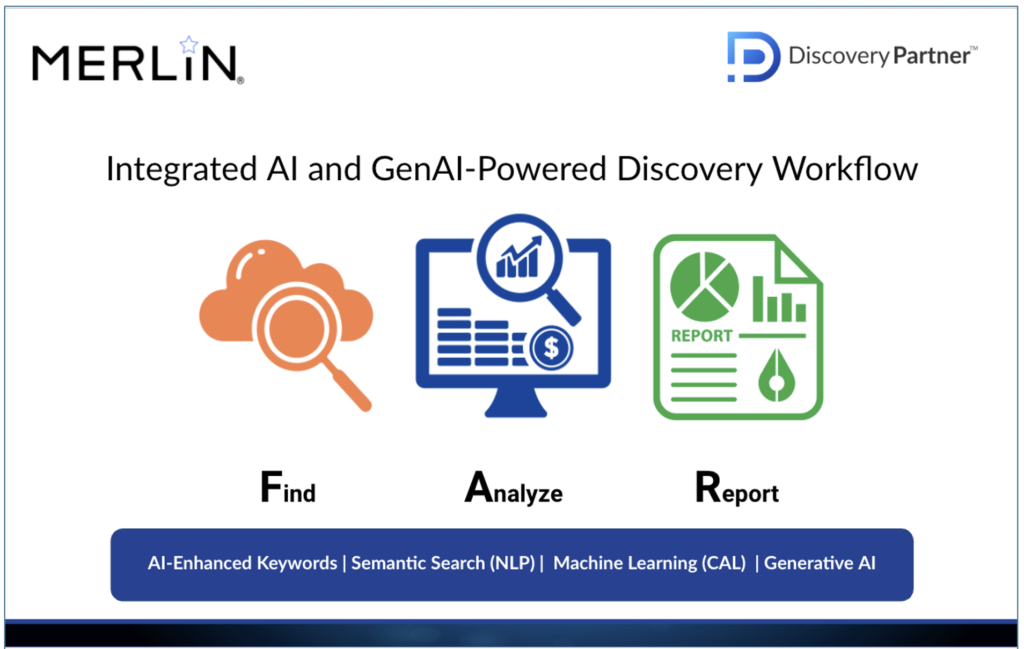 DiscoveryPartner, Merlin’s flagship offering, is an advanced cloud-based discovery platform that seamlessly blends cutting-edge Generative AI and machine learning with traditional search and review capabilities. It offers sub-second search speed and advanced AI to help people find and analyze information in large document sets–including PDFs, emails, office files, medical records, transcripts and chat messages.