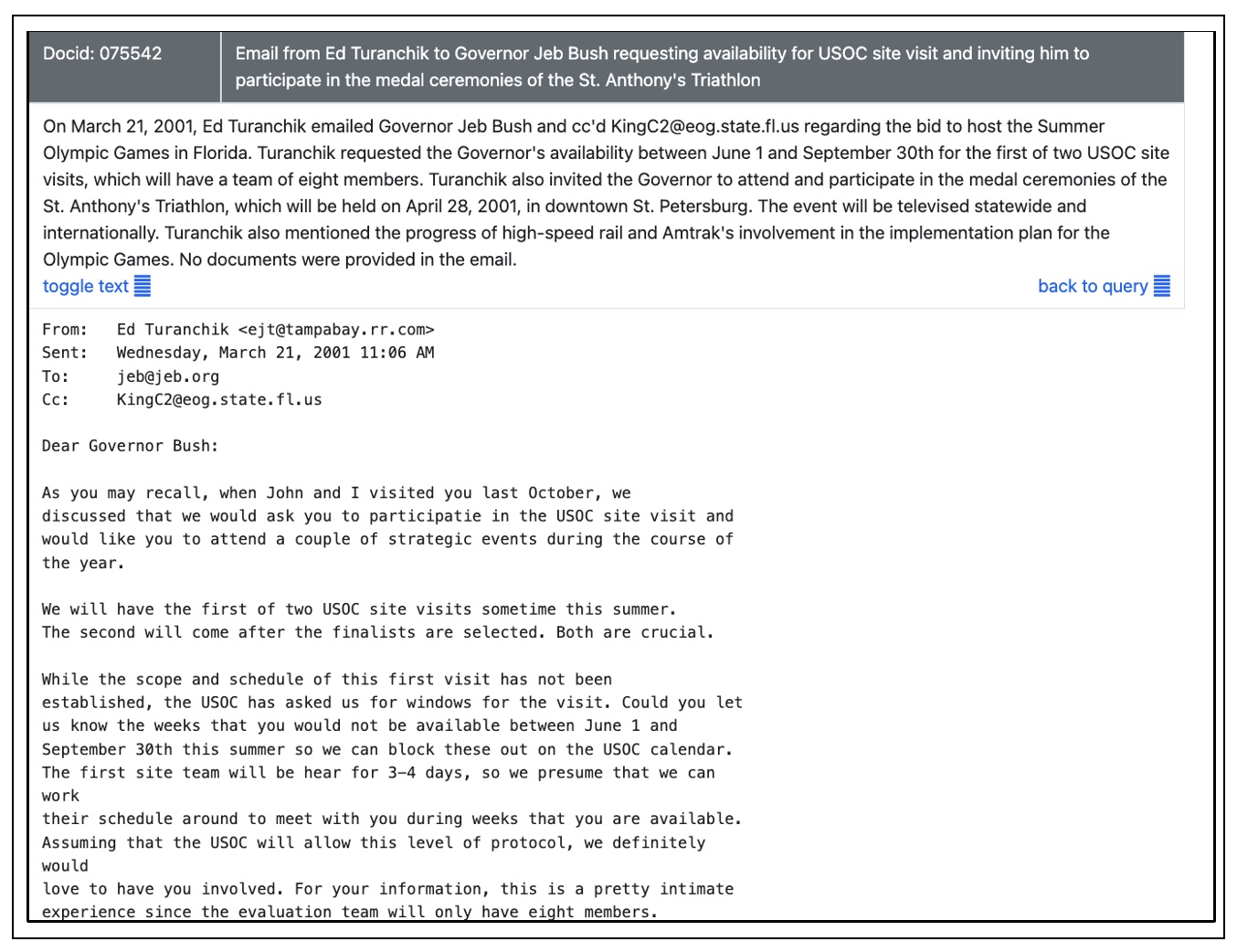 – March 21, 2001: Email from Ed Turanchik to Governor Bush requesting availability for first USOC site visit between June 1 – September 30. Also invited Governor to triathlon event related to bid.
