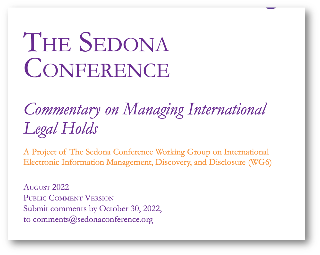 I am excited to report that the Sedona Commentary on Managing International Legal Holds has just been released for Public Comment. This was a four-year project for a number of us who served on both the brainstorming and the drafting team and it is nice to see that our vision held up.