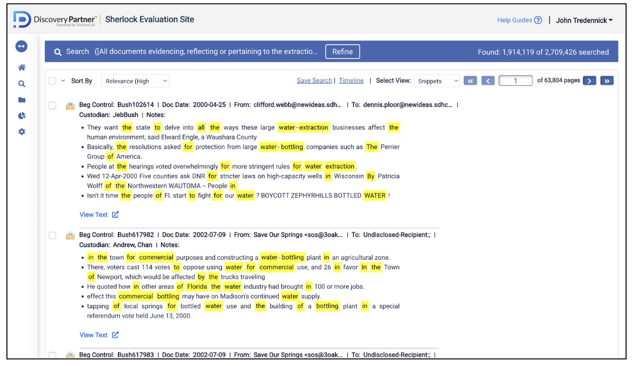 To start, we inserted the text of our document request: “Bottled Water — All documents concerning the extraction of water in Florida for bottling by commercial enterprises” into DiscoveryPartner’s (DP’s) search window.