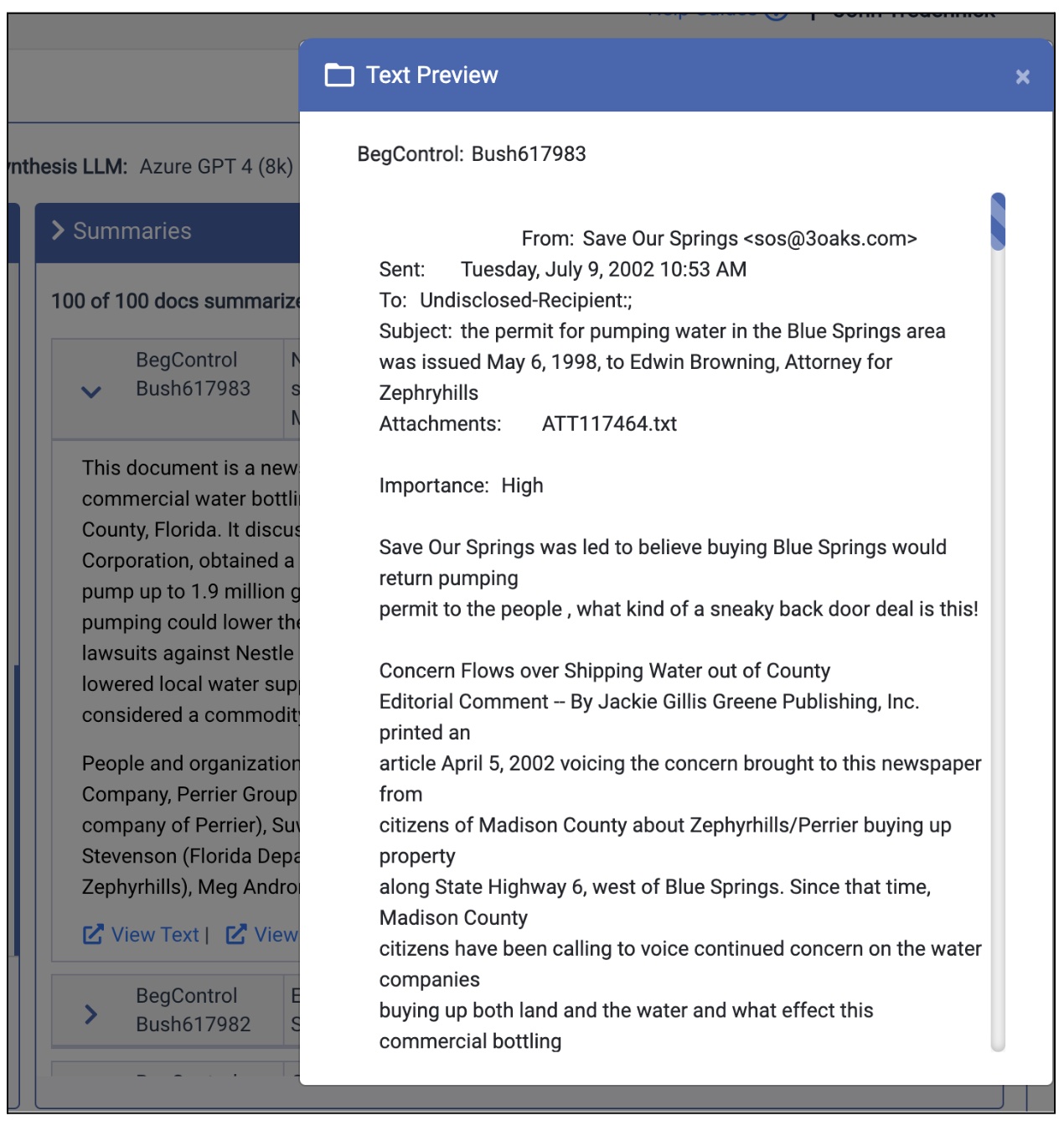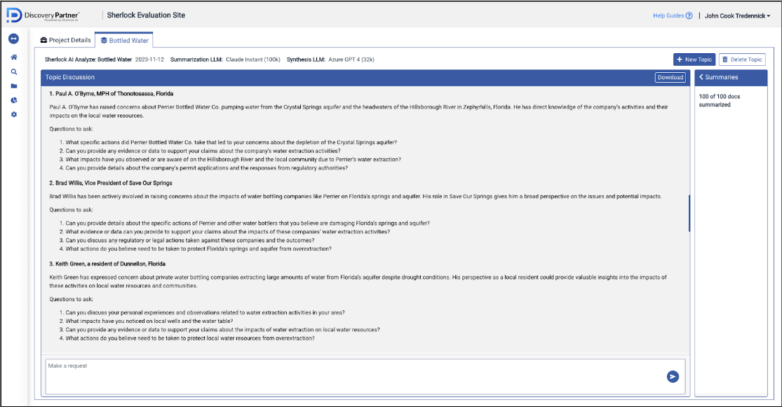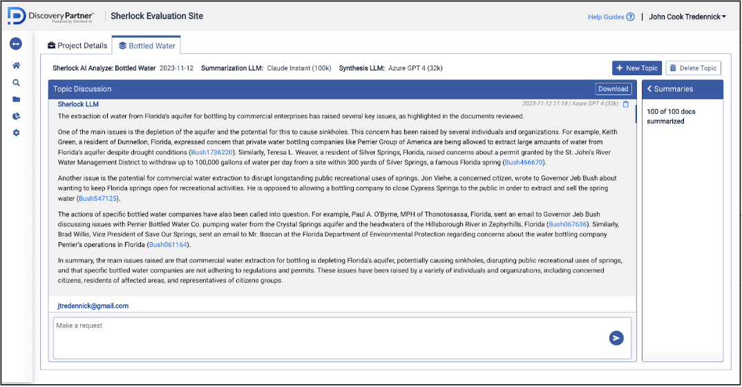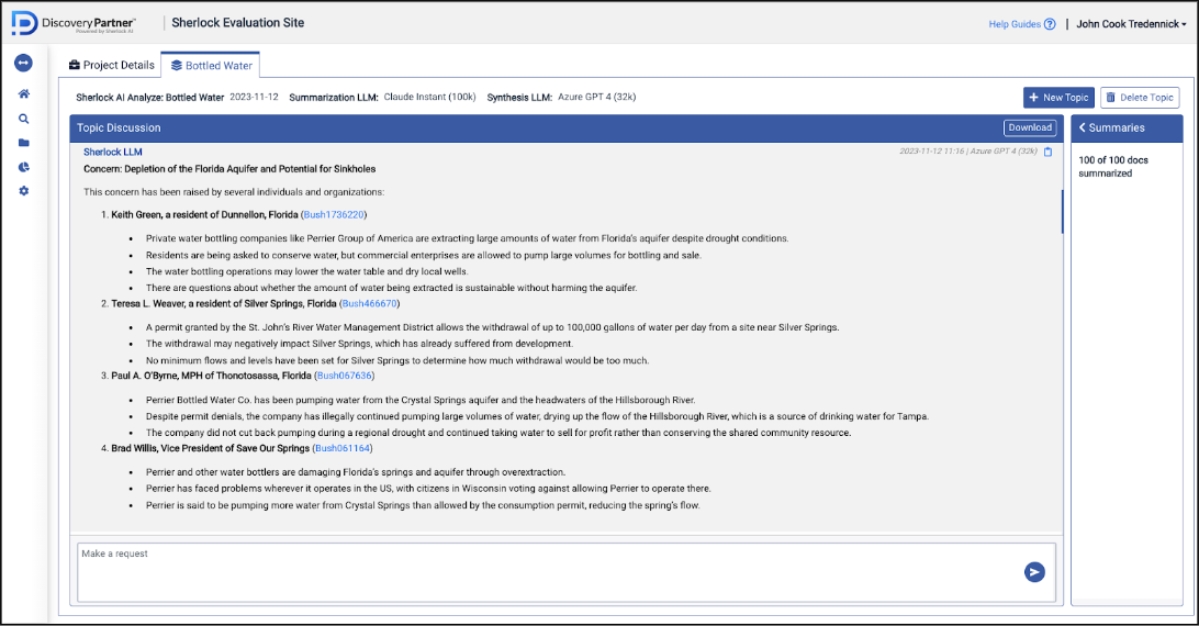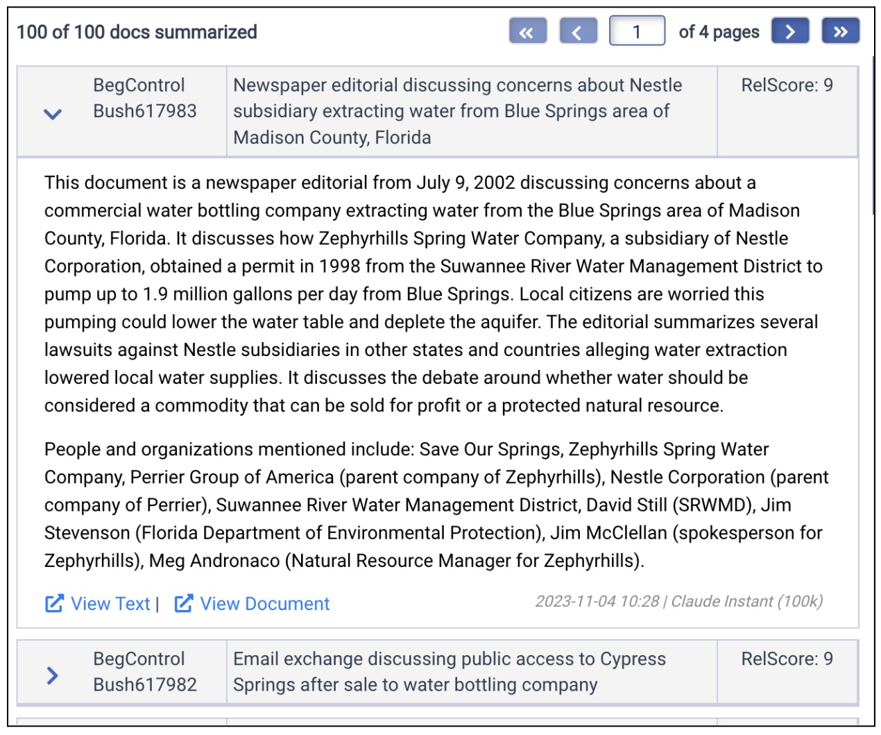 In this case, we are asking Sherlock to read, analyze, and summarize 100 likely relevant documents which we found from our search (shown in the snippets page above). The chosen GenAI engine (Claude Instant or GPT 3.5) will quickly read all of the documents and present summaries for each, like this top-ranked summary below.
