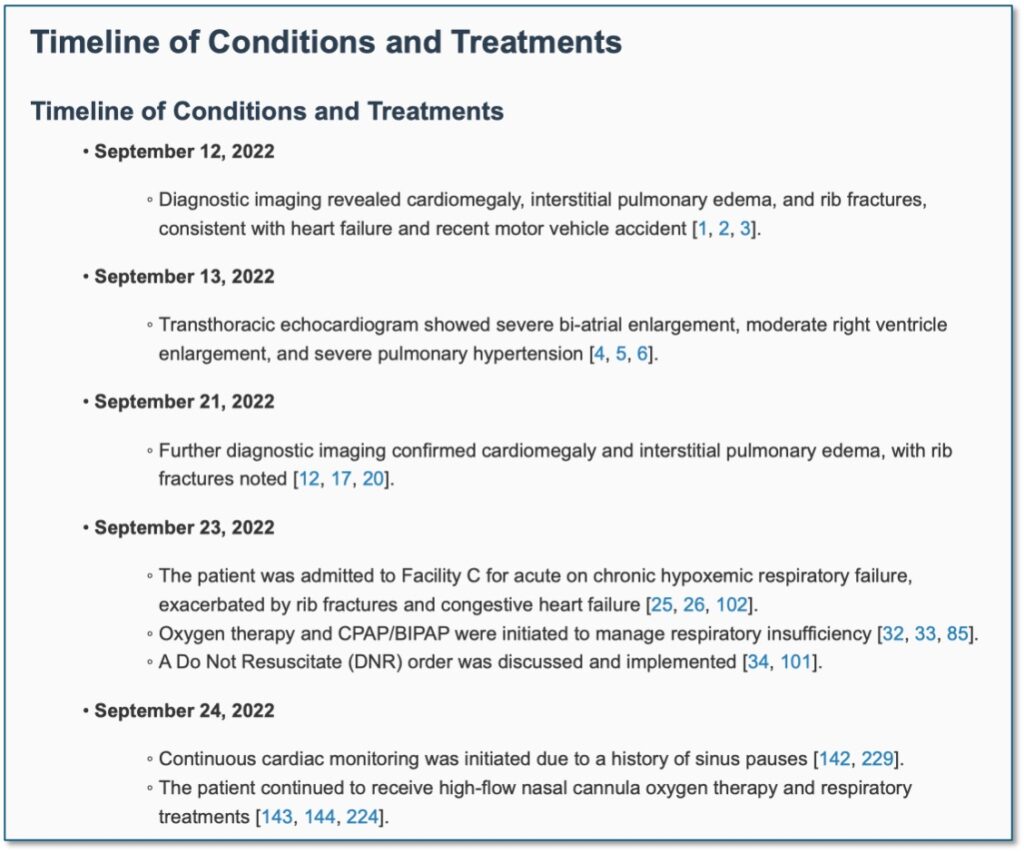 - Critical medical events and timeline markers