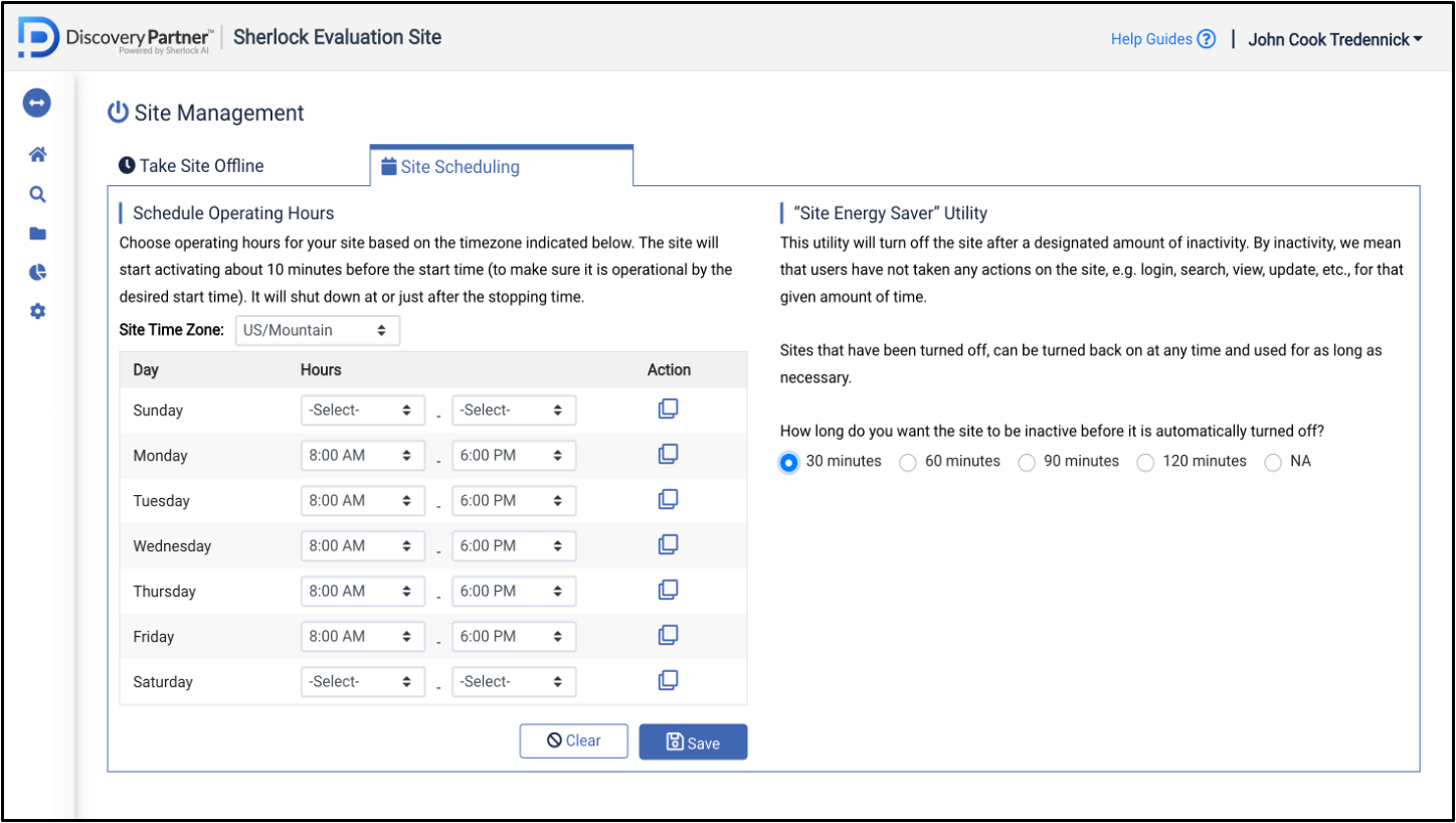 Cloud Utility Pricing allows clients to control hosting charges. Administrators can turn off the site through DiscoveryPartner’s administration module. They can also schedule operating hours or use Merlin’s unique Cloud Energy Saver to automatically turn off the site when not in use. These features alone can cut hosting costs by half, even on a site undergoing active review. Clients can also shut down sites for the entire month when the matter is dormant. Any user with the site passcode can turn it back on in minutes.