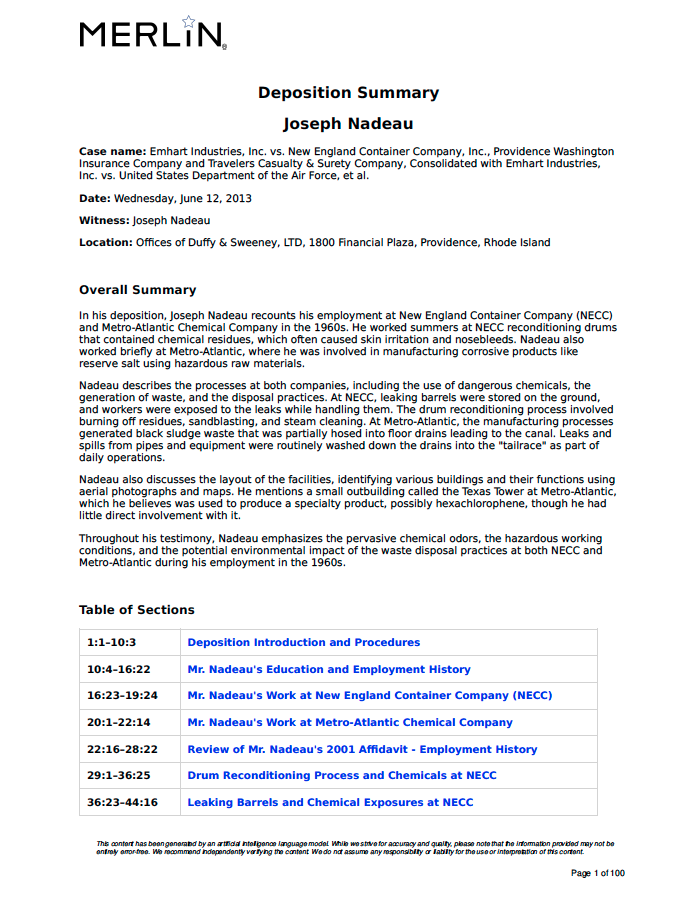 See how TranscriptPartner transforms complex testimony into clear, actionable insights. We provide samples in both PDF and Word formats, with direct links to source testimony so you can verify accuracy and coverage yourself.