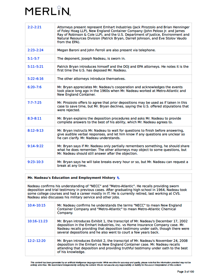 Within each section, TranscriptPartner summarizes admissions and testimony at the page-line level, offering direct references and quick access to specific statements for simplicity.